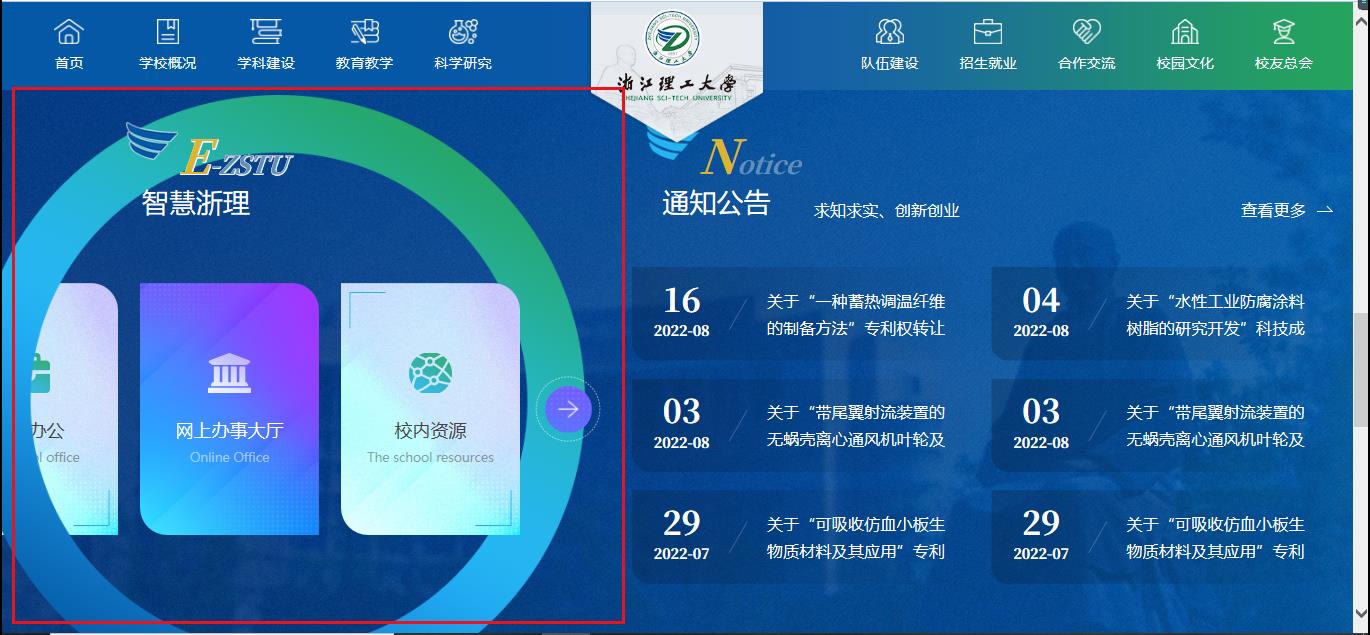 各位师生常用的校内资源(VPN通道)、网上办事大厅、图书馆服务、邮件服务、新闻资讯等已整合在了主页面的“智慧浙理E-zstu”板块,实现了“一站式”服务。如下图所示:
