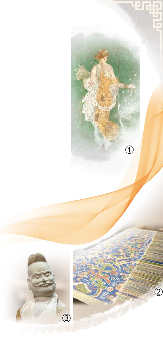 丝绸之路绵亘万里,延续千年。公元2世纪,中国运送到罗马的上等丝绸售价达每磅12盎司黄金,即454克丝绸等价于340克黄金,有“软黄金”之称,一度成为欧洲最为珍贵的纺织品。意大利那不勒斯国家考古博物馆便藏有一幅庞贝古城壁画《花神芙罗拉》,画中花神身着丝绸美服,留下动人倩影。古罗马作家老普林尼的《自然史》亦描述了丝绸远销罗马的情景:“赛里斯国林中产丝,驰名宇内。丝生于树叶上,取出、湿之以水,理之成丝。后织成锦绣文绮,贩运至罗马……”