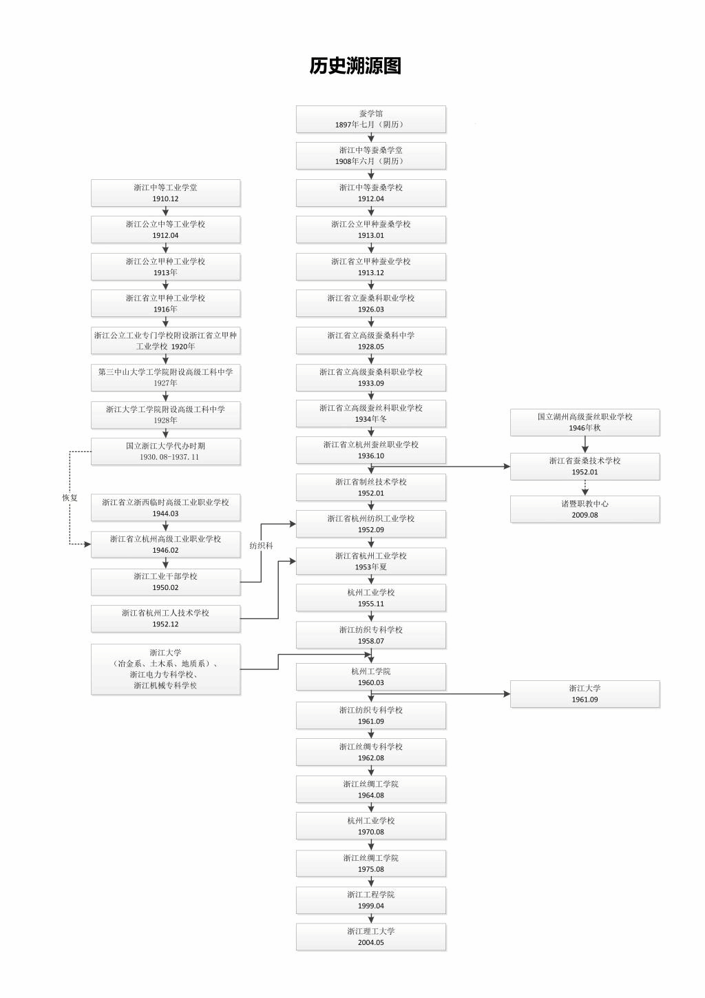 1912年,学校更名为“浙江中等蚕桑学校”;1913年,先后更名为“浙江公立甲种蚕桑学校”“浙江省立甲种蚕业学校”;1926年,更名为“浙江省立蚕桑科职业学校”;1927年,从五年级起分设制丝、养蚕两系,并开始招收女生,实行男女同校。1928年后,先后更名为“浙江省立高级蚕桑科中学”“浙江省立高级蚕桑科职业学校”“浙江省立高级蚕丝科职业学校”;1936年,更名为“浙江省立杭州蚕丝职业学校”。